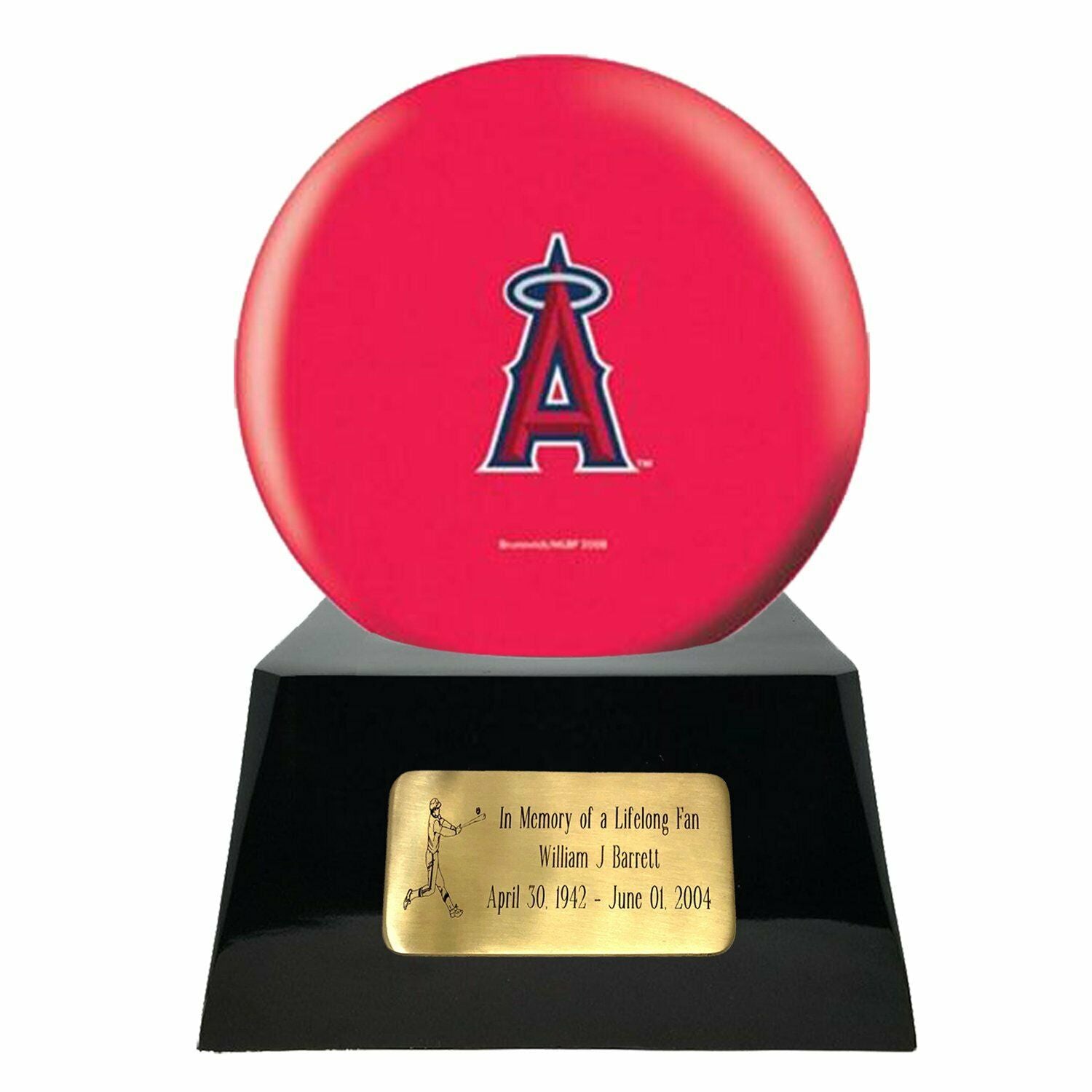 The item you are looking at is our Number 034-IUKR323, a large/adult sized, black colored metal cremation urn base displaying a Los Angeles Angels metal team ball.