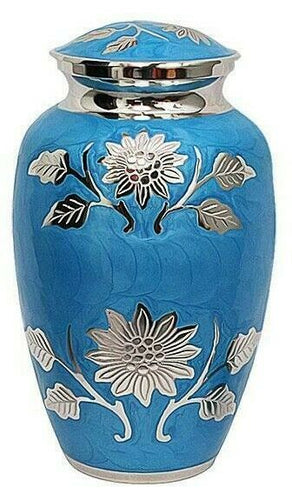 Large/Adult 200 Cubic Inch Blue Sunflower Brass Funeral Cremation Urn for Ashes