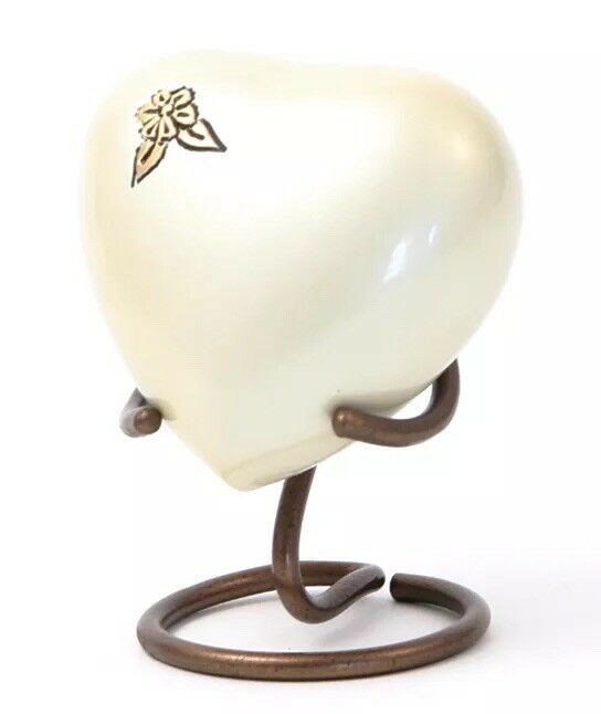You will be spellbound with this cremation urn from our Artisan Collection as it inspires you to take a trip down memory lane with your loved one. This heart shaped keepsake size piece in a traditional design is characterized by a hand-engraved flower with a delicate metallic luster finish in cool soft cream. This also includes a soft velvet box in a rich blue tone.