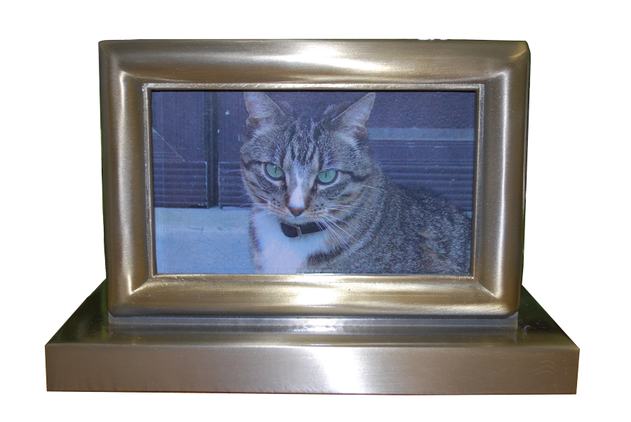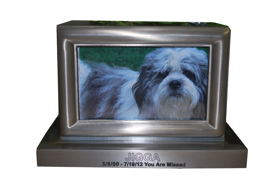 The item you are looking at is our Number 036-HCM-KL-PHOTO-BN, a large sized, brushed nickel colored metal cremation urn.