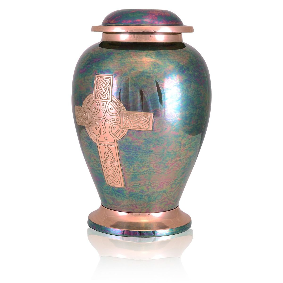 Handcrafted from solid brass through an artistic copper raku process, this urn features a radiant Celtic cross at its center, highlighted with copper-tone details. Its shimmering, iridescent finish and timeless design create a beautiful tribute to faith and memory.