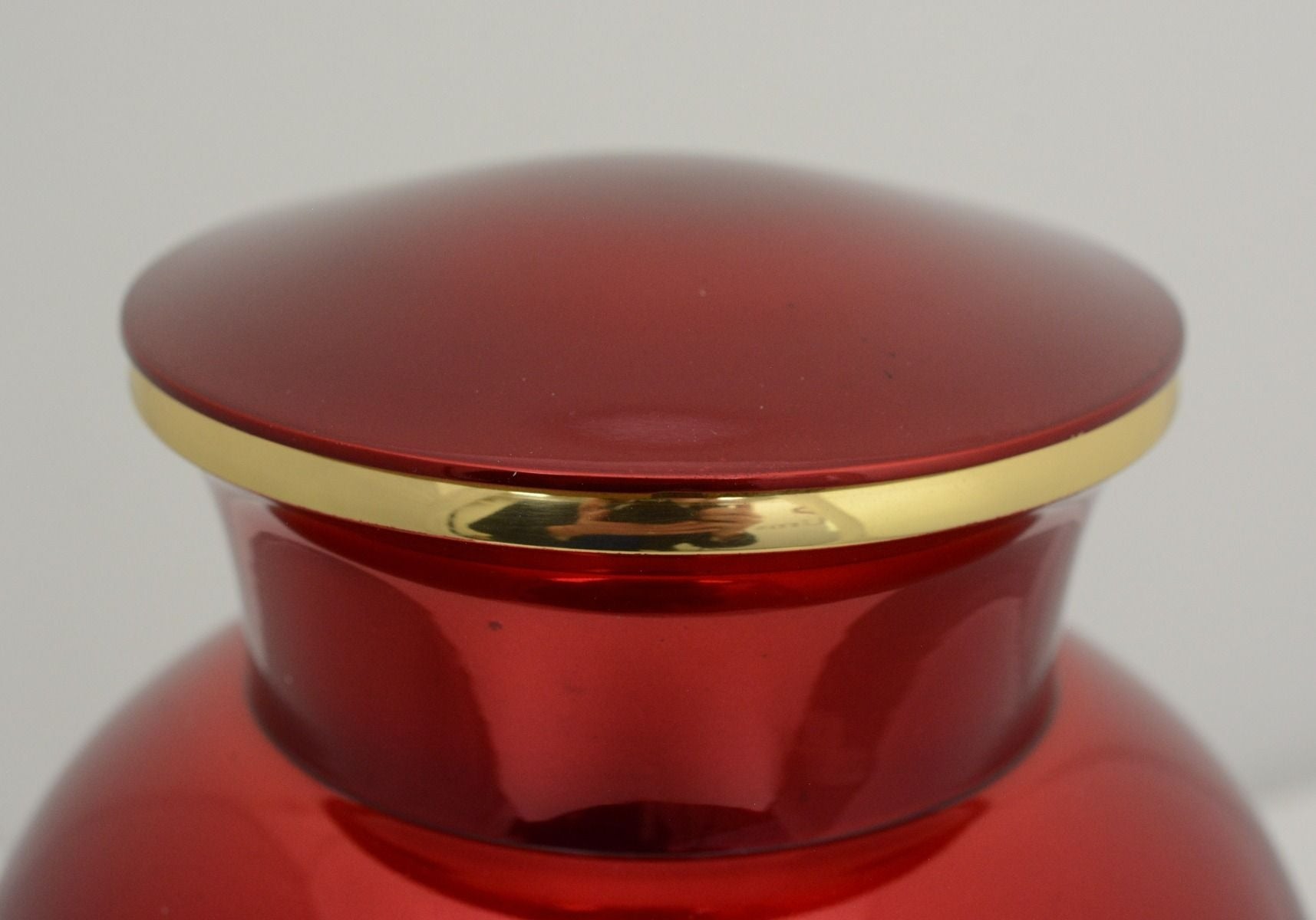 The item you are looking at is our Model Number 016-66429, a large/adult sized, rich red surface featuring a mother-of-pearl band with gold highlights cremation urn with secure closure.