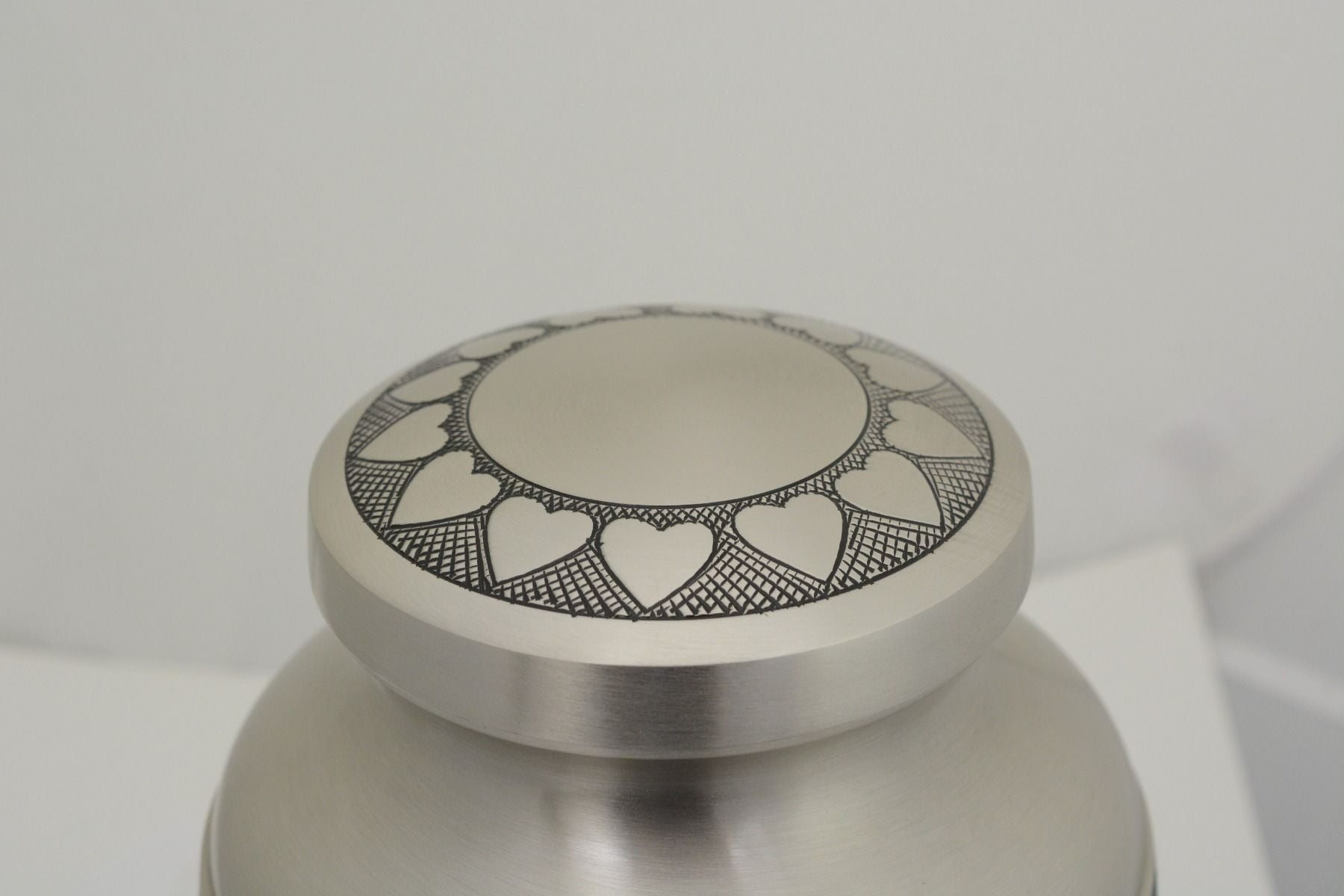 Crafted from high-quality brass through an artistic process that brings out its unique character, this urn features intricate and elegant designs, making it a sophisticated way to cherish a loved one. The spun, pewter finish is highlighted by a band of engraved hearts, symbolizing love and remembrance. Weather-resistant and versatile, it can be placed outdoors, in a garden, or used as a scattering or niche urn.