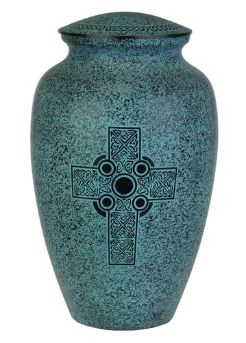 Large/Adult 220 Cubic Ins Turquoise Celtic Cross Brass Cremation Urn for Ashes