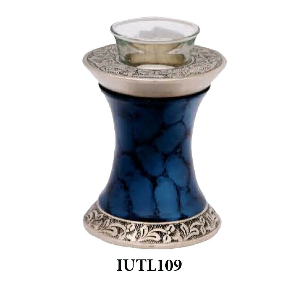 The item you are looking at is our Number 034-IUTL109, a small/keepsake sized, blue & gold colored brass cremation urn.