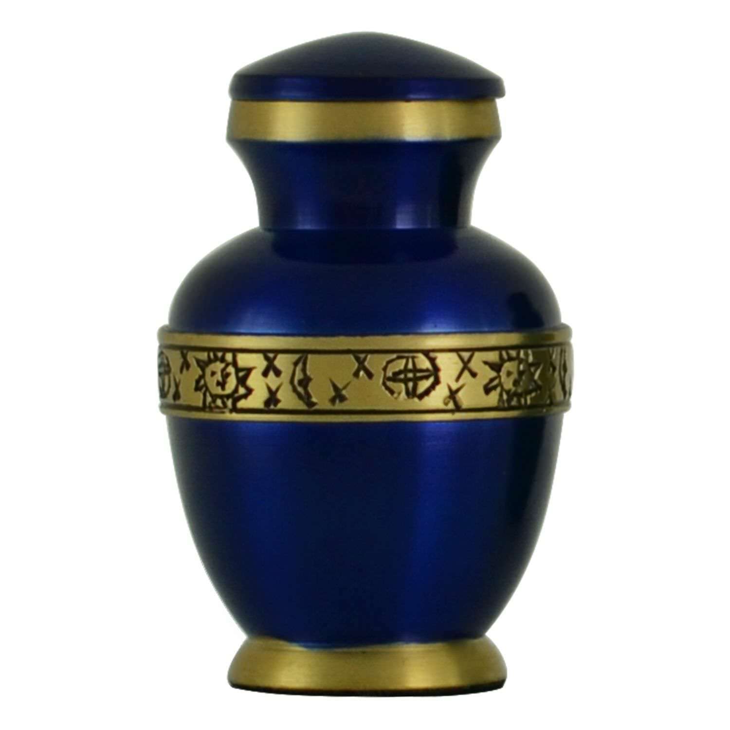 Handcrafted by skilled artisans from genuine brass. Finished in a rich navy satin blue, it features hand-engraved celestial details in gold, with a moon and stars motif at its center. Compact and beautifully designed, it holds a small portion of cremains, offering families a symbolic and elegant tribute.