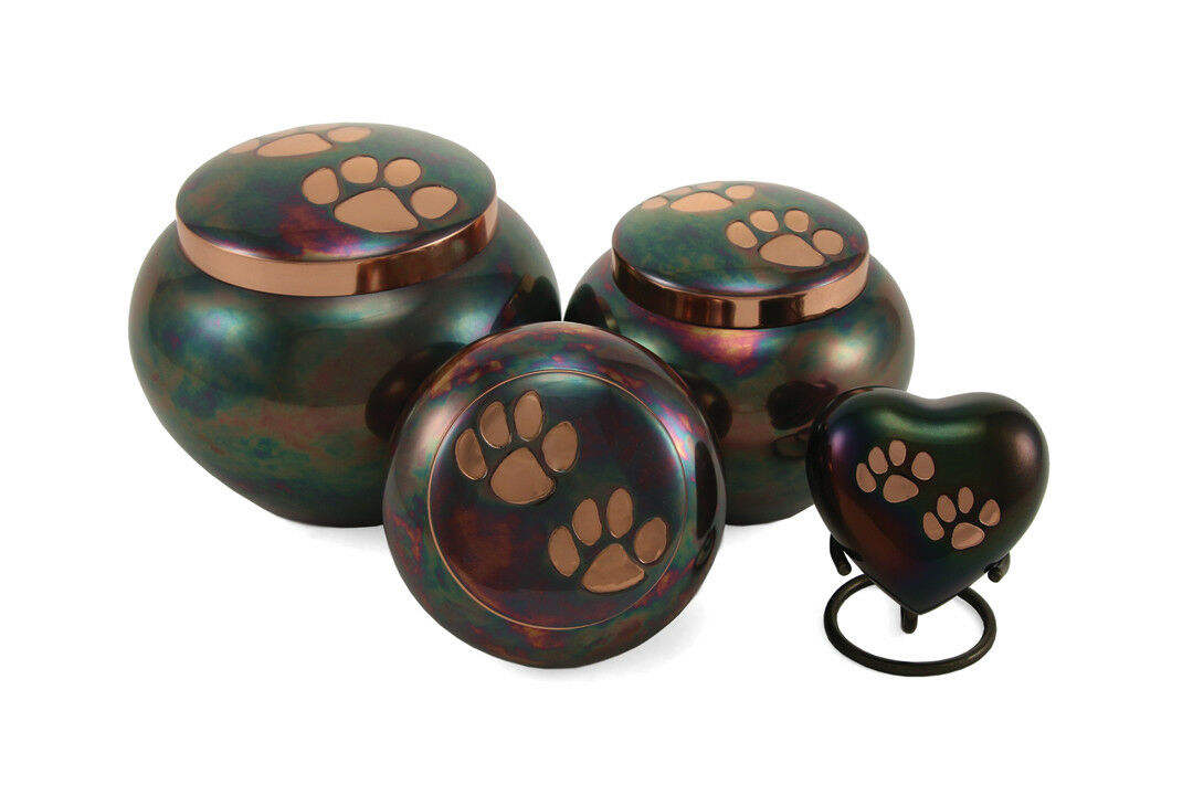 Handcrafted in brass and electroplated in three beautiful finishes, the Odyssey urns are accented with paw prints and are available in three pet sizes to accommodate most small and mid-sized pets.