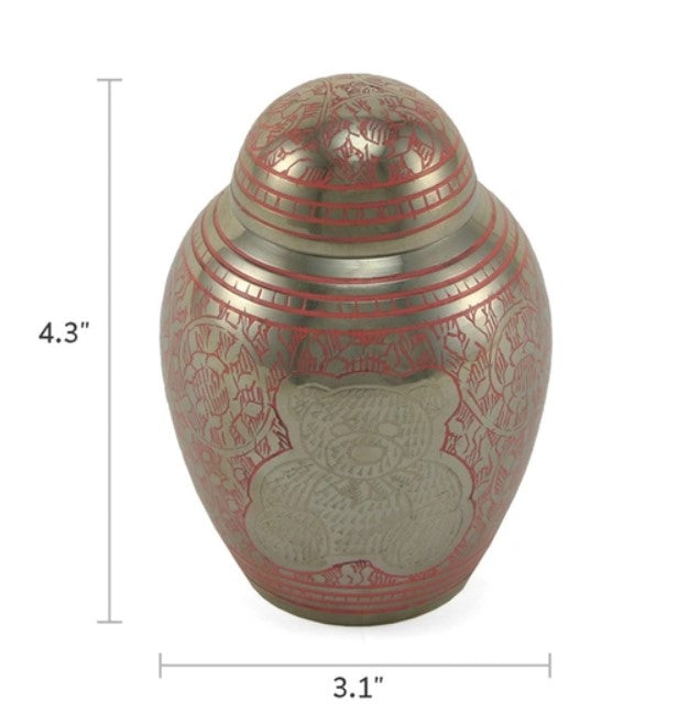The item you are looking at is our Model Number 012-2660P. During an unimaginable time, find some comfort in knowing your beloved child is laid to rest with a friend, a loving teddy bear. This petite brass urn features a reflective pink finish with pewter etching. Display this memorial at home in a special place where you can reflect on and remember your loved one. Each urn is one-of-a-king with no two pieces being identical.