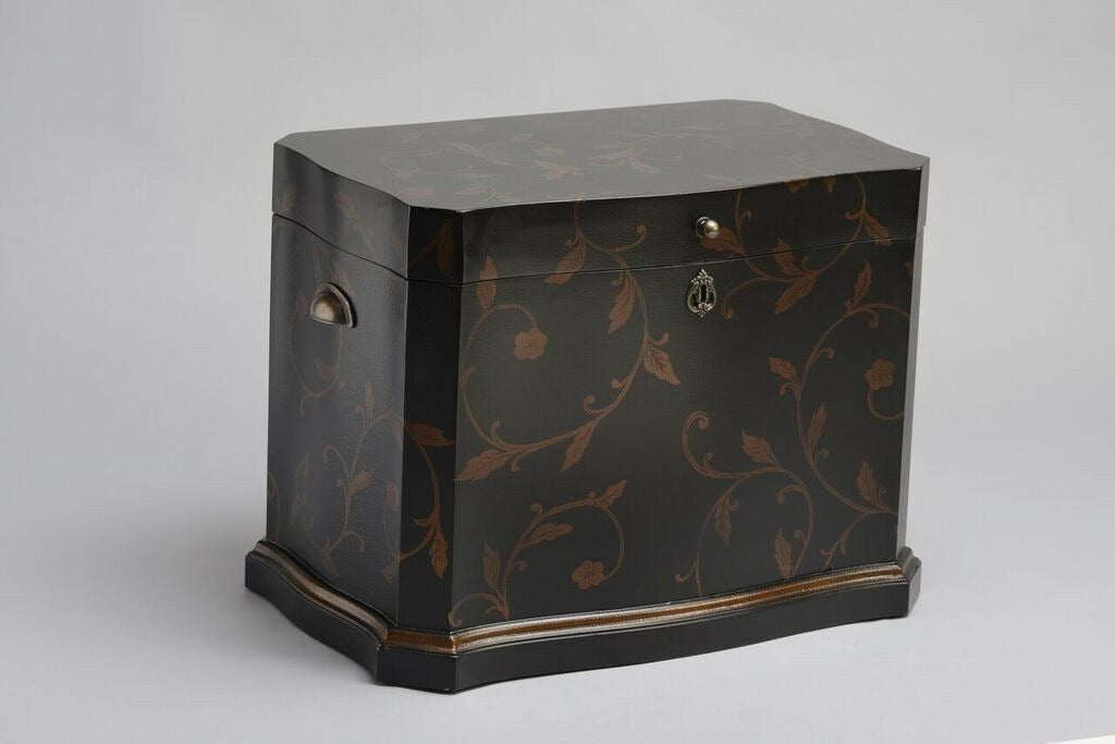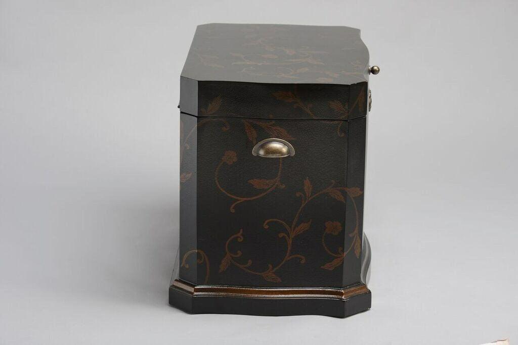 Elegant curves and a bold gold-painted border frame the Athenian Life Chest, whose leathered exterior is adorned with hand-painted gold foil leaf accents. The interior, lined in luxurious chocolate velvet, contains three vertical dividers and a removable sectioned tray, offering a beautiful and lasting home for cherished memories.