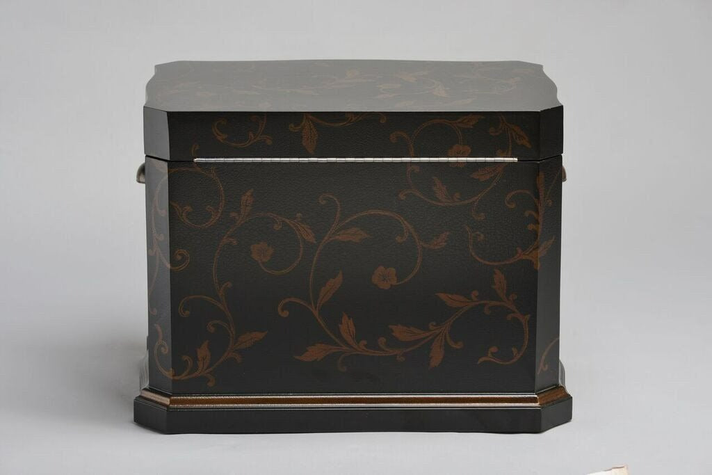 The item you are looking at is our Model Number 016-71552, a large/adult sized, majestic curves and a thick gold-painted border highlight this elegantly shaped Life Chest. The exterior features a hand-painted gold foil leaf design over a leathered finish, while the interior is lined in rich chocolate velvet.
