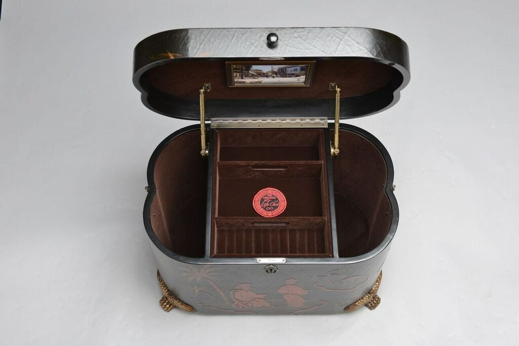 Graceful in form and rich in detail, the Dynasty tells a story of tradition and artistry. Its rounded corners and claw-foot base frame exquisite hand-painted scenes inspired by Asian landscapes, set against a beautifully textured surface. Inside, velvet lining and carefully designed compartments offer a refined space for cherished memories.