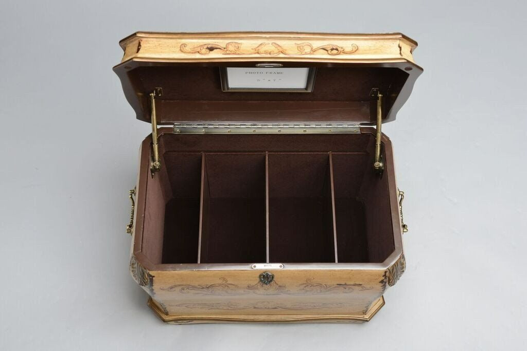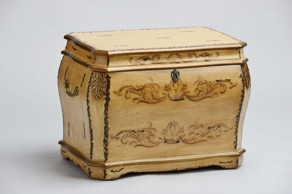Inspired by the beauty of old-world craftsmanship, the Florence Life Chest showcases hand-painted details and classic European motifs. Its antique ochre finish with rubbed sienna accents and gold embellishments gives it an aged, elegant character. The interior is lined in soft chocolate velvet and includes three dividers and a removable tray, offering a graceful way to organize treasured mementos.