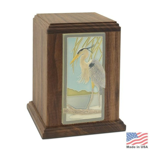 Large/Adult 220 Cubic Inches Blue Heron Tile Wood Funeral Cremation Urn for Ashes