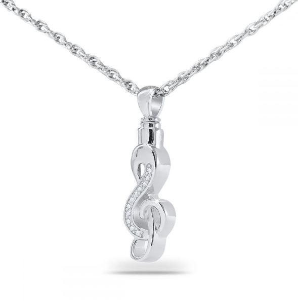 A touching tribute for music lovers, this stainless steel keepsake pendant is shaped as a treble clef accented with sparkling crystals. It securely holds a small amount of cremains or another treasured keepsake and includes a stainless steel chain for wearing near the heart.