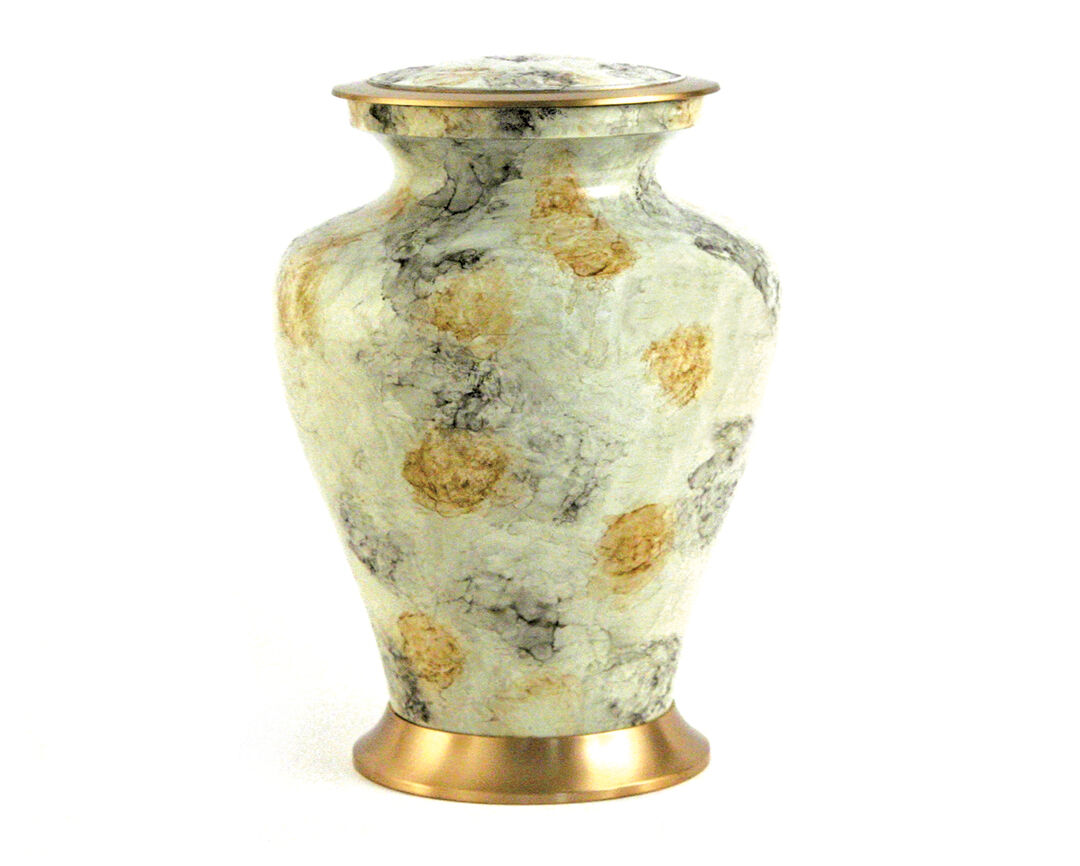 Bring joy to your heart as you remember your loved one with this cremation urn from our Glenwood Collection. As a lightweight and cost-effective alternative to real marble, this handcrafted piece is painted white with gorgeous swirls of yellow and black for an uncanny resemblance. This heart shaped keepsake size piece is ideal for families seeking a beautiful yet conscious option. This also includes a soft velvet box in a rich blue tone.