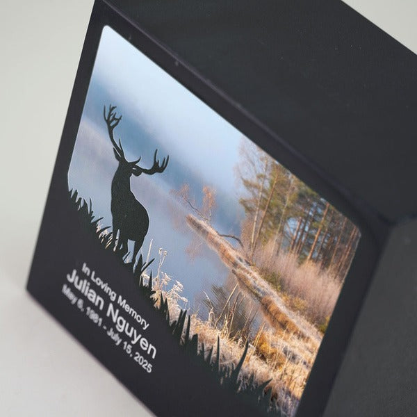 Monumental Memorials Elk, Full Size Urn, honors those drawn to the mountains each fall, capturing the spirit of adventure and purpose. Crafted from natural black marble, each urn displays unique veining and color variations, making every piece distinct. Handcrafted by in-house designers, this elegant urn includes a bag with tie and is secured with a threaded bottom closure. Enhance this meaningful tribute with custom personalization to create a lasting remembrance.