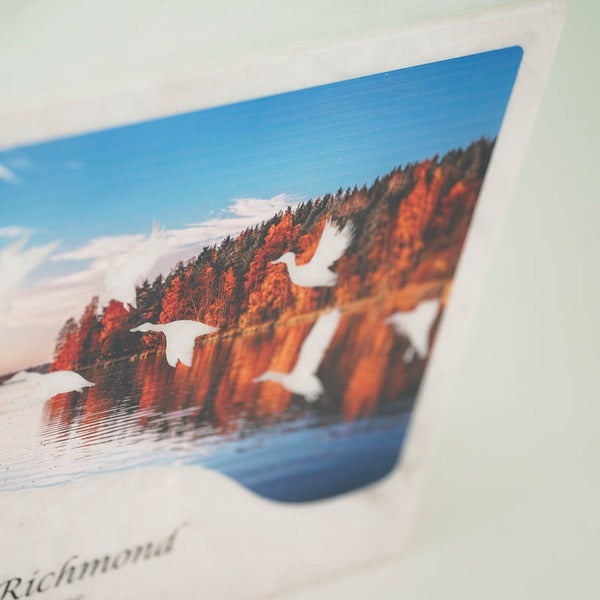 Monumental Memorials Take Flight, Full Size Urn, honors the love of nature and the joy and adventure it brought to their life. The Take Flight design serves as a lasting reminder of their passion for the outdoors and the beauty it provided. Made of natural white marble, each urn displays unique veining and color variations, ensuring a one-of-a-kind tribute. Handcrafted by in-house designers, it includes a bag with tie and is secured with a threaded bottom closure. Enhance this meaningful memorial with custom personalization to create a cherished keepsake.