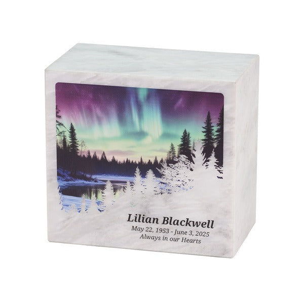 Monumental Memorials Aurora, Full Size Urn, captures the serene beauty of the northern lights, honoring those who cherished the majesty of nature. Crafted from natural white marble, each urn is unique with its own veining and color variations. Monumental Memorials are handcrafted and made to order by in-house artists. This elegant piece includes a bag with tie and is secured with a threaded bottom closure, and can be personalized to create a meaningful, lasting tribute.