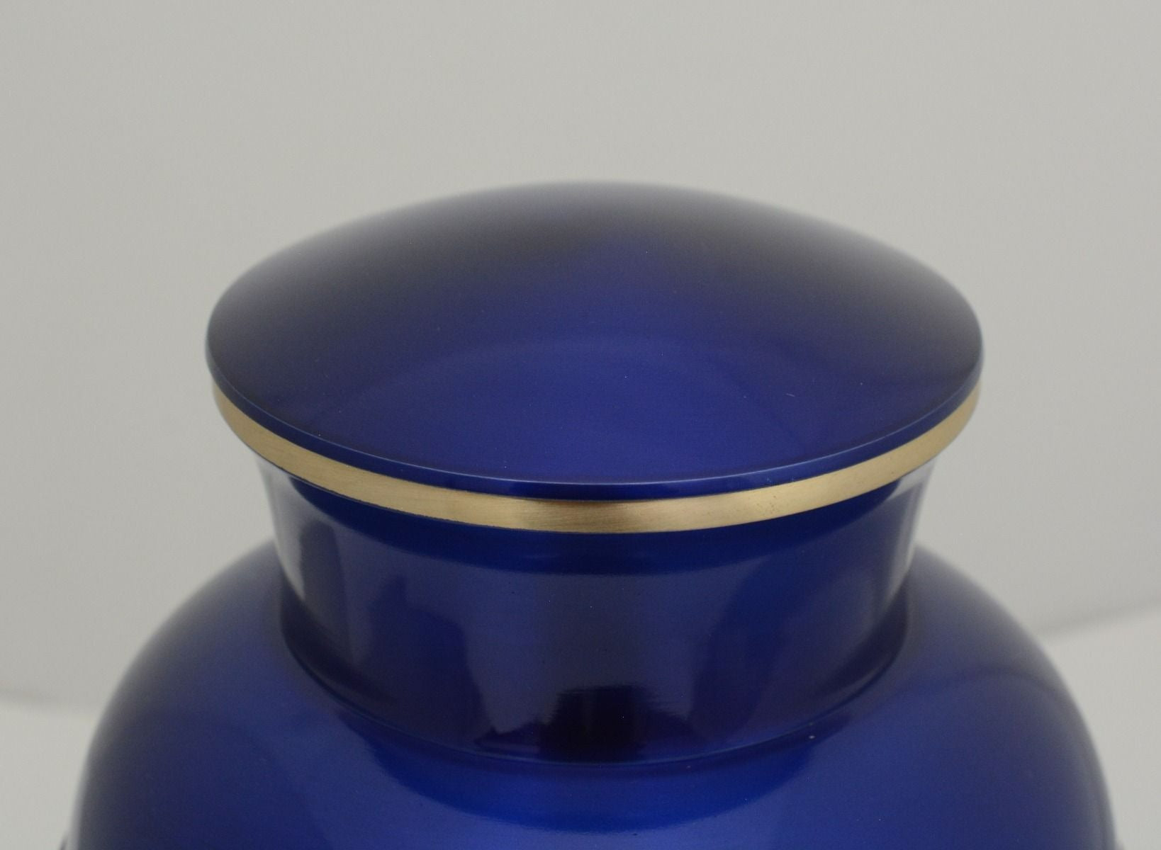 Handcrafted from fine brass, this urn features a rich blue finish accented by a genuine Mother of Pearl band. The gleaming contrast of materials creates a timeless design that offers both beauty and comfort.